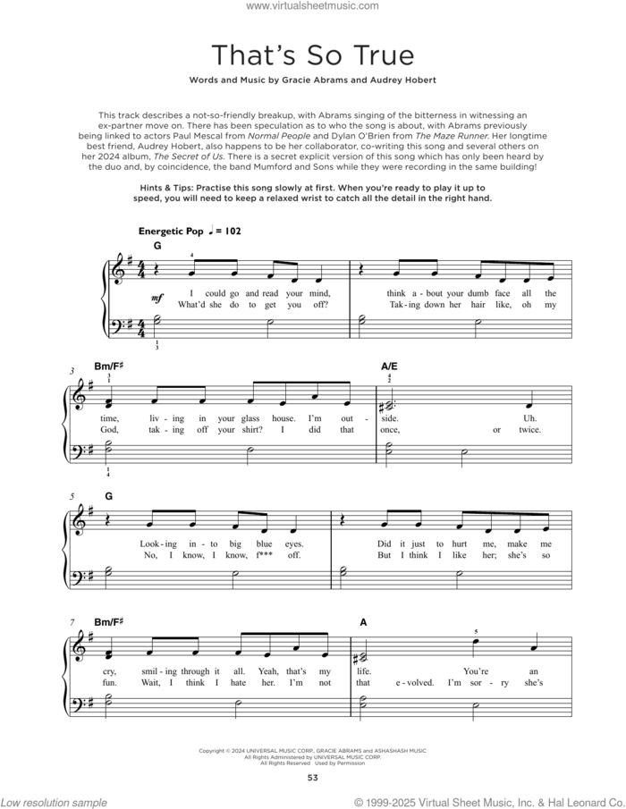This new feature (still experimental) allows you to ask questions related to this music title to our AI music assistant (powered by OpenAI ChatGPT), trained to answer as an expert on this music title.You may ask questions like "When was this song written?" or "How would you suggest approaching this song?" You can also ask questions about the author or anything else you may think of. Just enter your queries inside the field on the top of the displayed music and click the "Ask" button on the left to start chatting. Remember that the assistant cannot perform catalog searches. It is focused only on this music title. It could also give you wrong or imperfect answers. In that case, click the "regenerate" button on the side of the answer to replace it with a new one. And, of course, you can provide feedback for each answer so we can improve the system. ![]() Gracie Abrams: That's So True for piano solo, beginner piano sheet music. Includes an High-Quality PDF file to download instantly. Licensed to Virtual Sheet Music® by Hal Leonard® publishing company. NOTE: The image above is just a preview of the first page of this item. Buy this item to display, print, and enjoy the complete music. Basic Score Info