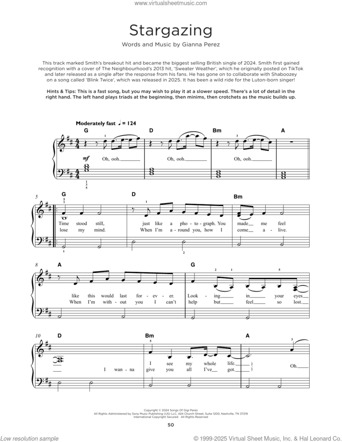 This new feature (still experimental) allows you to ask questions related to this music title to our AI music assistant (powered by OpenAI ChatGPT), trained to answer as an expert on this music title.You may ask questions like "When was this song written?" or "How would you suggest approaching this song?" You can also ask questions about the author or anything else you may think of. Just enter your queries inside the field on the top of the displayed music and click the "Ask" button on the left to start chatting. Remember that the assistant cannot perform catalog searches. It is focused only on this music title. It could also give you wrong or imperfect answers. In that case, click the "regenerate" button on the side of the answer to replace it with a new one. And, of course, you can provide feedback for each answer so we can improve the system. ![]() Myles Smith: Stargazing, (beginner) for piano solo, beginner piano sheet music. Includes an High-Quality PDF file to download instantly. Licensed to Virtual Sheet Music® by Hal Leonard® publishing company. NOTE: The image above is just a preview of the first page of this item. Buy this item to display, print, and enjoy the complete music. Basic Score Info