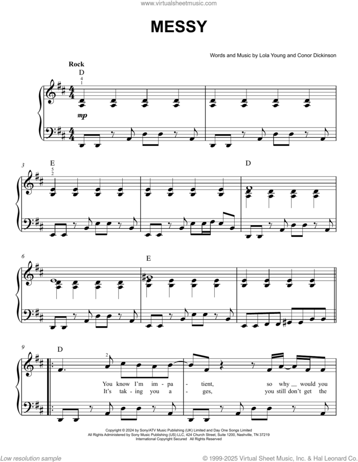 This new feature (still experimental) allows you to ask questions related to this music title to our AI music assistant (powered by OpenAI ChatGPT), trained to answer as an expert on this music title.You may ask questions like "When was this song written?" or "How would you suggest approaching this song?" You can also ask questions about the author or anything else you may think of. Just enter your queries inside the field on the top of the displayed music and click the "Ask" button on the left to start chatting. Remember that the assistant cannot perform catalog searches. It is focused only on this music title. It could also give you wrong or imperfect answers. In that case, click the "regenerate" button on the side of the answer to replace it with a new one. And, of course, you can provide feedback for each answer so we can improve the system. ![]() Lola Young: Messy, (easy) for piano solo, easy piano sheet music. High-Quality and Interactive, transposable in any key, play along. Includes an High-Quality PDF file to download instantly. Licensed to Virtual Sheet Music® by Hal Leonard® publishing company. NOTE: The sample above is just the first page preview of this item. Buy this item to display, print, and play the complete music. Basic Score Info