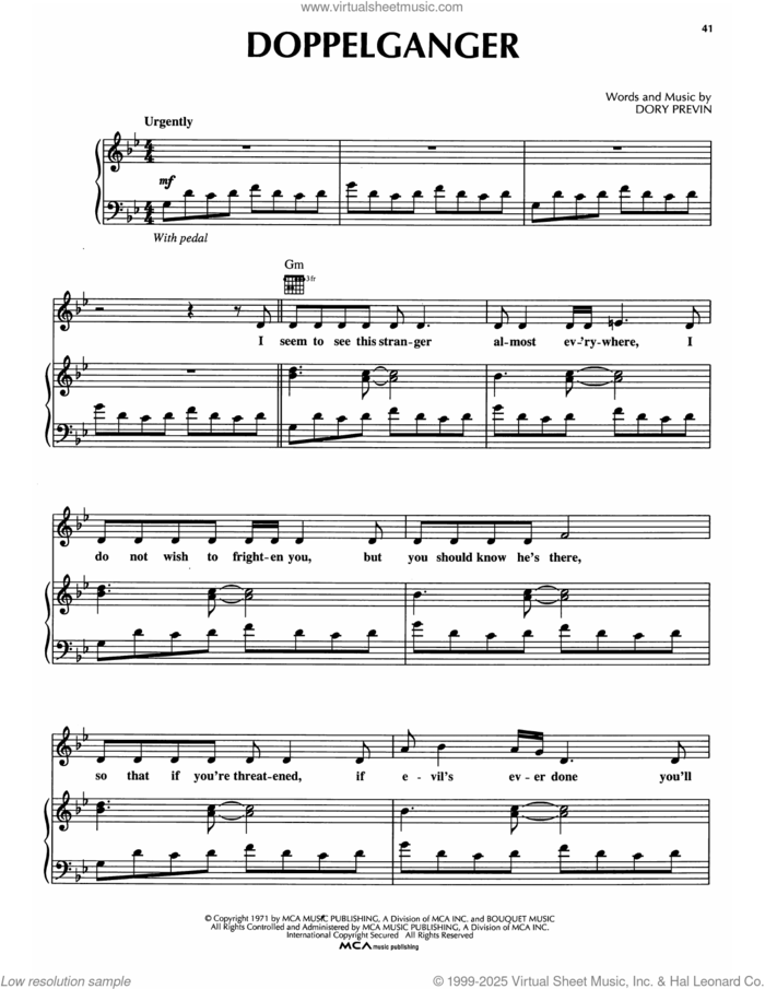 This new feature (still experimental) allows you to ask questions related to this music title to our AI music assistant (powered by OpenAI ChatGPT), trained to answer as an expert on this music title.You may ask questions like "When was this song written?" or "How would you suggest approaching this song?" You can also ask questions about the author or anything else you may think of. Just enter your queries inside the field on the top of the displayed music and click the "Ask" button on the left to start chatting. Remember that the assistant cannot perform catalog searches. It is focused only on this music title. It could also give you wrong or imperfect answers. In that case, click the "regenerate" button on the side of the answer to replace it with a new one. And, of course, you can provide feedback for each answer so we can improve the system. ![]() Dory Previn: Doppelganger for voice, piano or guitar, intermediate sheet music. Includes an High-Quality PDF file to download instantly. Licensed to Virtual Sheet Music® by Hal Leonard® publishing company. NOTE: The image above is just a preview of the first page of this item. Buy this item to display, print, and enjoy the complete music. Basic Score Info