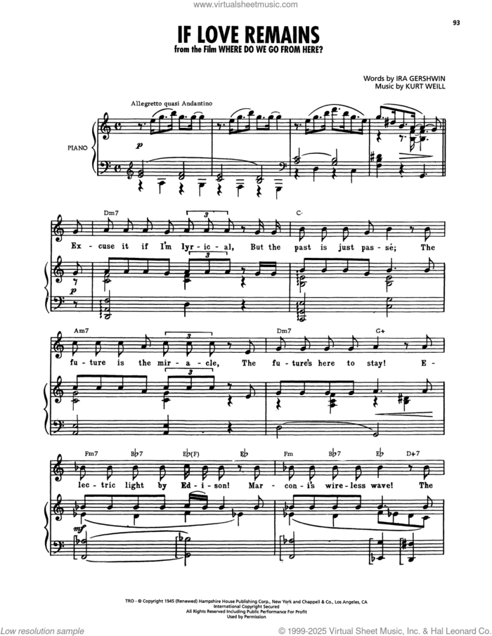 This new feature (still experimental) allows you to ask questions related to this music title to our AI music assistant (powered by OpenAI ChatGPT), trained to answer as an expert on this music title.You may ask questions like "When was this song written?" or "How would you suggest approaching this song?" You can also ask questions about the author or anything else you may think of. Just enter your queries inside the field on the top of the displayed music and click the "Ask" button on the left to start chatting. Remember that the assistant cannot perform catalog searches. It is focused only on this music title. It could also give you wrong or imperfect answers. In that case, click the "regenerate" button on the side of the answer to replace it with a new one. And, of course, you can provide feedback for each answer so we can improve the system. ![]() Ira Gershwin: If Love Remains (from Where Do We Go From Here?) for voice, piano or guitar, intermediate sheet music. Includes an High-Quality PDF file to download instantly. Licensed to Virtual Sheet Music® by Hal Leonard® publishing company. NOTE: The image above is just a preview of the first page of this item. Buy this item to display, print, and enjoy the complete music. Basic Score Info
