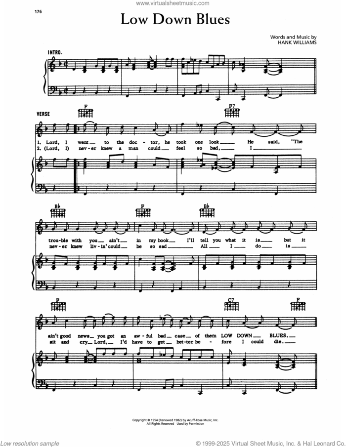 This new feature (still experimental) allows you to ask questions related to this music title to our AI music assistant (powered by OpenAI ChatGPT), trained to answer as an expert on this music title.You may ask questions like "When was this song written?" or "How would you suggest approaching this song?" You can also ask questions about the author or anything else you may think of. Just enter your queries inside the field on the top of the displayed music and click the "Ask" button on the left to start chatting. Remember that the assistant cannot perform catalog searches. It is focused only on this music title. It could also give you wrong or imperfect answers. In that case, click the "regenerate" button on the side of the answer to replace it with a new one. And, of course, you can provide feedback for each answer so we can improve the system. ![]() Hank Williams: Low Down Blues for voice, piano or guitar, intermediate sheet music. Includes an High-Quality PDF file to download instantly. Licensed to Virtual Sheet Music® by Hal Leonard® publishing company. NOTE: The image above is just a preview of the first page of this item. Buy this item to display, print, and enjoy the complete music. Basic Score Info