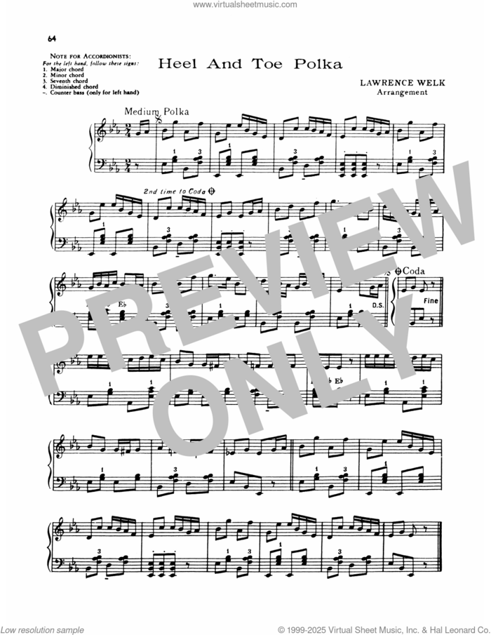 This new feature (still experimental) allows you to ask questions related to this music title to our AI music assistant (powered by OpenAI ChatGPT), trained to answer as an expert on this music title.You may ask questions like "When was this song written?" or "How would you suggest approaching this song?" You can also ask questions about the author or anything else you may think of. Just enter your queries inside the field on the top of the displayed music and click the "Ask" button on the left to start chatting. Remember that the assistant cannot perform catalog searches. It is focused only on this music title. It could also give you wrong or imperfect answers. In that case, click the "regenerate" button on the side of the answer to replace it with a new one. And, of course, you can provide feedback for each answer so we can improve the system. ![]() Lawrence Welk: Heel And Toe Polka for piano solo, intermediate piano sheet music. Includes an High-Quality PDF file to download instantly. Licensed to Virtual Sheet Music® by Hal Leonard® publishing company. NOTE: The image above is just a preview of the first page of this item. Buy this item to display, print, and enjoy the complete music. Basic Score Info