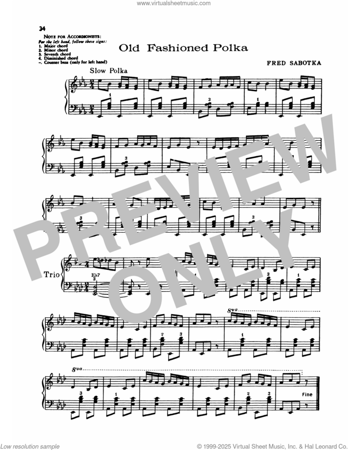 This new feature (still experimental) allows you to ask questions related to this music title to our AI music assistant (powered by OpenAI ChatGPT), trained to answer as an expert on this music title.You may ask questions like "When was this song written?" or "How would you suggest approaching this song?" You can also ask questions about the author or anything else you may think of. Just enter your queries inside the field on the top of the displayed music and click the "Ask" button on the left to start chatting. Remember that the assistant cannot perform catalog searches. It is focused only on this music title. It could also give you wrong or imperfect answers. In that case, click the "regenerate" button on the side of the answer to replace it with a new one. And, of course, you can provide feedback for each answer so we can improve the system. ![]() Lawrence Welk: Old Fashioned Polka for piano solo, intermediate piano sheet music. Includes an High-Quality PDF file to download instantly. Licensed to Virtual Sheet Music® by Hal Leonard® publishing company. NOTE: The image above is just a preview of the first page of this item. Buy this item to display, print, and enjoy the complete music. Basic Score Info