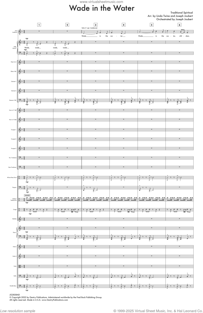 This new feature (still experimental) allows you to ask questions related to this music title to our AI music assistant (powered by OpenAI ChatGPT), trained to answer as an expert on this music title.You may ask questions like "When was this song written?" or "How would you suggest approaching this song?" You can also ask questions about the author or anything else you may think of. Just enter your queries inside the field on the top of the displayed music and click the "Ask" button on the left to start chatting. Remember that the assistant cannot perform catalog searches. It is focused only on this music title. It could also give you wrong or imperfect answers. In that case, click the "regenerate" button on the side of the answer to replace it with a new one. And, of course, you can provide feedback for each answer so we can improve the system. ![]() Wade In The Water (arr. Linda Twine and Joseph Joubert) (COMPLETE) for orchestra/band, intermediate sheet music. Includes an High-Quality PDF file to download instantly. Licensed to Virtual Sheet Music® by Hal Leonard® publishing company. NOTE: The image above is just a preview of the first page of this item. Buy this item to display, print, and enjoy the complete music.