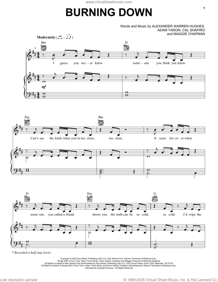 This new feature (still experimental) allows you to ask questions related to this music title to our AI music assistant (powered by OpenAI ChatGPT), trained to answer as an expert on this music title.You may ask questions like "When was this song written?" or "How would you suggest approaching this song?" You can also ask questions about the author or anything else you may think of. Just enter your queries inside the field on the top of the displayed music and click the "Ask" button on the left to start chatting. Remember that the assistant cannot perform catalog searches. It is focused only on this music title. It could also give you wrong or imperfect answers. In that case, click the "regenerate" button on the side of the answer to replace it with a new one. And, of course, you can provide feedback for each answer so we can improve the system. ![]() Alex Warren: Burning Down for voice, piano or guitar, intermediate sheet music. High-Quality and Interactive, transposable in any key, play along. Includes an High-Quality PDF file to download instantly. Licensed to Virtual Sheet Music® by Hal Leonard® publishing company. NOTE: The sample above is just the first page preview of this item. Buy this item to display, print, and play the complete music. Basic Score Info