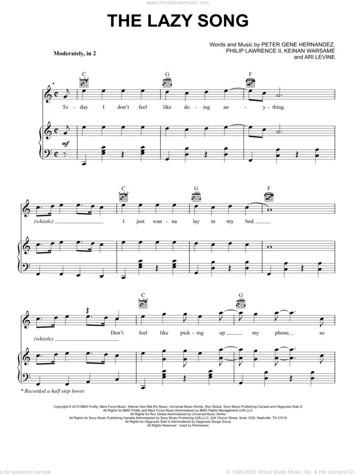 This new feature (still experimental) allows you to ask questions related to this music title to our AI music assistant (powered by OpenAI ChatGPT), trained to answer as an expert on this music title.You may ask questions like "When was this song written?" or "How would you suggest approaching this song?" You can also ask questions about the author or anything else you may think of. Just enter your queries inside the field on the top of the displayed music and click the "Ask" button on the left to start chatting. Remember that the assistant cannot perform catalog searches. It is focused only on this music title. It could also give you wrong or imperfect answers. In that case, click the "regenerate" button on the side of the answer to replace it with a new one. And, of course, you can provide feedback for each answer so we can improve the system. ![]() Bruno Mars: The Lazy Song for voice, piano or guitar, intermediate sheet music. High-Quality and Interactive, transposable in any key, play along. Includes an High-Quality PDF file to download instantly. Licensed to Virtual Sheet Music® by Hal Leonard® publishing company. NOTE: The sample above is just the first page preview of this item. Buy this item to display, print, and play the complete music. Basic Score Info