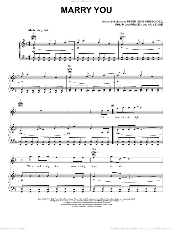 Bruno Mars: Marry You for voice, piano or guitar, intermediate sheet music. High-Quality and Interactive, transposable in any key, play along. Includes an High-Quality PDF file to download instantly. Licensed to Virtual Sheet Music® by Hal Leonard® publishing company.