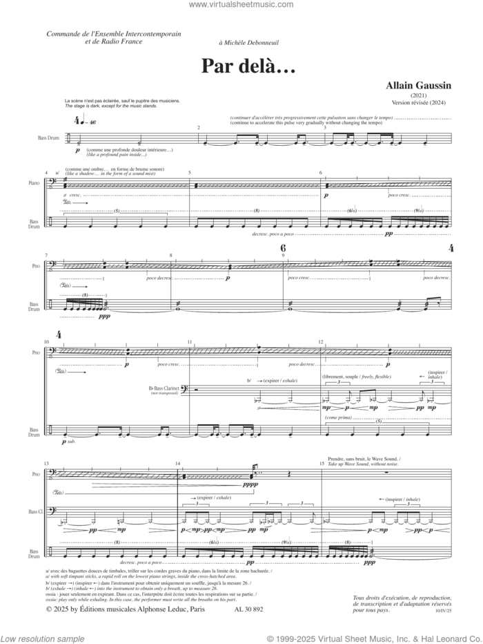 This new feature (still experimental) allows you to ask questions related to this music title to our AI music assistant (powered by OpenAI ChatGPT), trained to answer as an expert on this music title.You may ask questions like "When was this piece written?" or "How would you suggest approaching this piece?" You can also ask questions about the author or anything else you may think of. Just enter your queries inside the field on the top of the displayed music and click the "Ask" button on the left to start chatting. Remember that the assistant cannot perform catalog searches. It is focused only on this music title. It could also give you wrong or imperfect answers. In that case, click the "regenerate" button on the side of the answer to replace it with a new one. And, of course, you can provide feedback for each answer so we can improve the system. ![]() Allain Gaussin: Par dela (COMPLETE) for chamber ensemble, intermediate sheet music. Includes an High-Quality PDF file to download instantly. Licensed to Virtual Sheet Music® by Hal Leonard® publishing company. NOTE: The image above is just a preview of the first page of this item. Buy this item to display, print, and enjoy the complete music. Basic Score Info