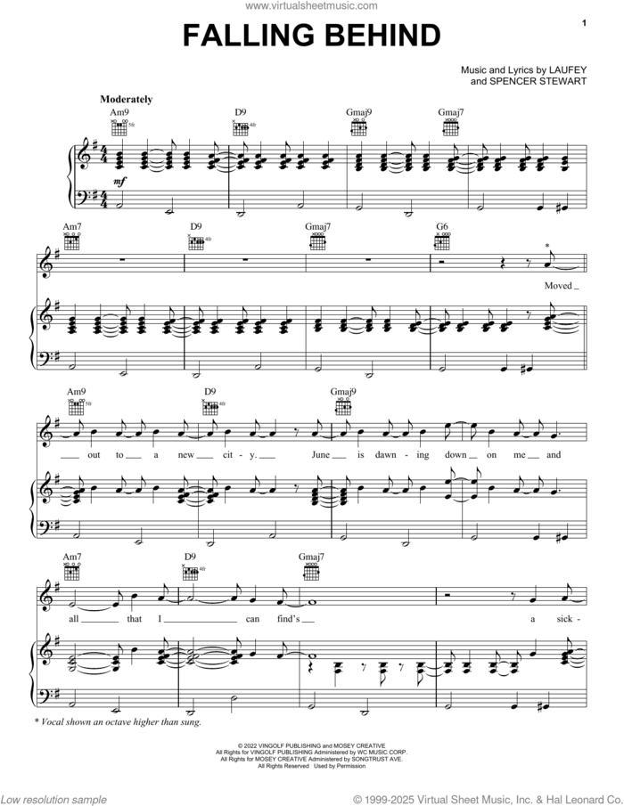 This new feature (still experimental) allows you to ask questions related to this music title to our AI music assistant (powered by OpenAI ChatGPT), trained to answer as an expert on this music title.You may ask questions like "When was this song written?" or "How would you suggest approaching this song?" You can also ask questions about the author or anything else you may think of. Just enter your queries inside the field on the top of the displayed music and click the "Ask" button on the left to start chatting. Remember that the assistant cannot perform catalog searches. It is focused only on this music title. It could also give you wrong or imperfect answers. In that case, click the "regenerate" button on the side of the answer to replace it with a new one. And, of course, you can provide feedback for each answer so we can improve the system. ![]() Laufey: Falling Behind for voice, piano or guitar, intermediate sheet music. High-Quality and Interactive, transposable in any key, play along. Includes an High-Quality PDF file to download instantly. Licensed to Virtual Sheet Music® by Hal Leonard® publishing company. NOTE: The sample above is just the first page preview of this item. Buy this item to display, print, and play the complete music. Basic Score Info