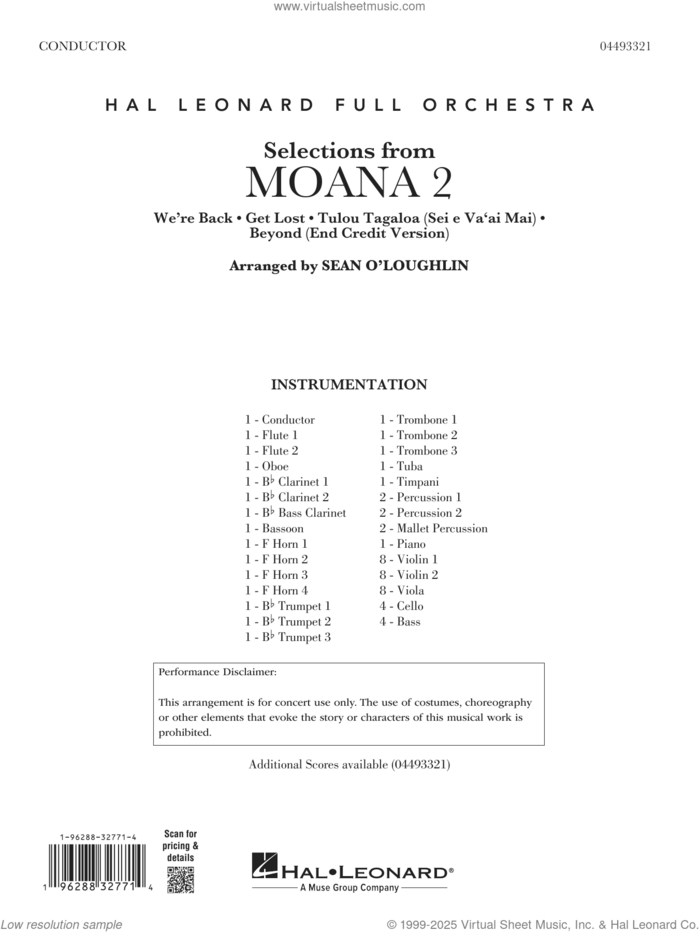 This new feature (still experimental) allows you to ask questions related to this music title to our AI music assistant (powered by OpenAI ChatGPT), trained to answer as an expert on this music title.You may ask questions like "When was this song written?" or "How would you suggest approaching this song?" You can also ask questions about the author or anything else you may think of. Just enter your queries inside the field on the top of the displayed music and click the "Ask" button on the left to start chatting. Remember that the assistant cannot perform catalog searches. It is focused only on this music title. It could also give you wrong or imperfect answers. In that case, click the "regenerate" button on the side of the answer to replace it with a new one. And, of course, you can provide feedback for each answer so we can improve the system. ![]() Opetaia Foa'i: Selections from Moana 2 (arr. Sean O'Loughlin) (COMPLETE) for full orchestra, intermediate sheet music. Includes an High-Quality PDF file to download instantly. Licensed to Virtual Sheet Music® by Hal Leonard® publishing company. NOTE: The image above is just a preview of the first page of this item. Buy this item to display, print, and enjoy the complete music. Basic Score Info