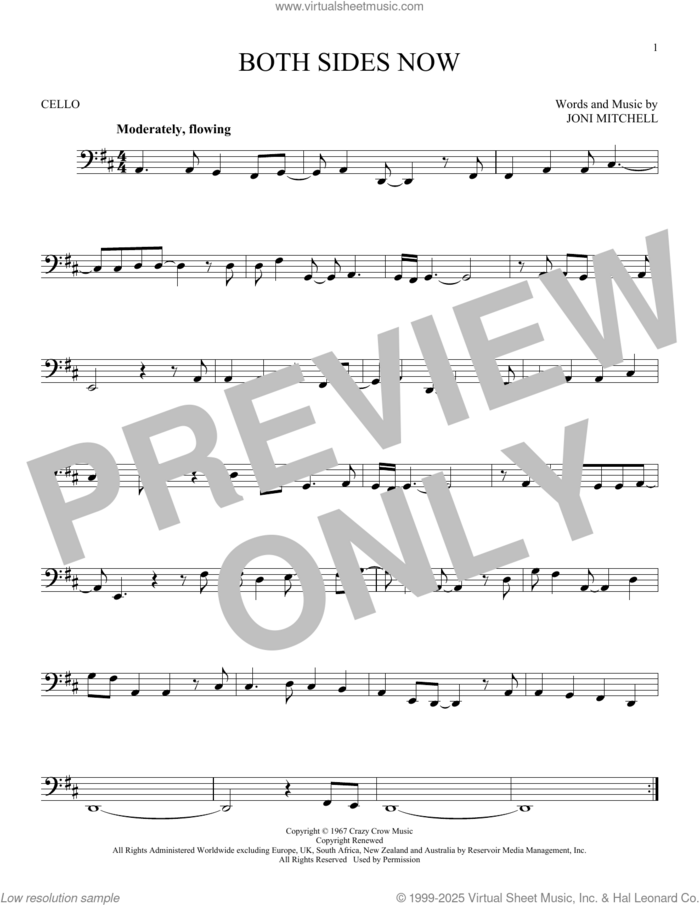 This new feature (still experimental) allows you to ask questions related to this music title to our AI music assistant (powered by OpenAI ChatGPT), trained to answer as an expert on this music title.You may ask questions like "When was this song written?" or "How would you suggest approaching this song?" You can also ask questions about the author or anything else you may think of. Just enter your queries inside the field on the top of the displayed music and click the "Ask" button on the left to start chatting. Remember that the assistant cannot perform catalog searches. It is focused only on this music title. It could also give you wrong or imperfect answers. In that case, click the "regenerate" button on the side of the answer to replace it with a new one. And, of course, you can provide feedback for each answer so we can improve the system. ![]() Joni Mitchell: Both Sides Now for cello solo, intermediate cello sheet music. High-Quality and Interactive, transposable in any key, play along. Includes an High-Quality PDF file to download instantly. Licensed to Virtual Sheet Music® by Hal Leonard® publishing company. NOTE: The sample above is just the first page preview of this item. Buy this item to display, print, and play the complete music. Basic Score Info