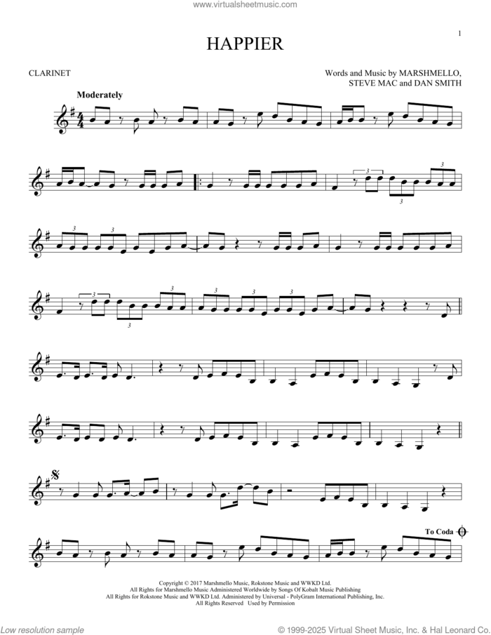 This new feature (still experimental) allows you to ask questions related to this music title to our AI music assistant (powered by OpenAI ChatGPT), trained to answer as an expert on this music title.You may ask questions like "When was this song written?" or "How would you suggest approaching this song?" You can also ask questions about the author or anything else you may think of. Just enter your queries inside the field on the top of the displayed music and click the "Ask" button on the left to start chatting. Remember that the assistant cannot perform catalog searches. It is focused only on this music title. It could also give you wrong or imperfect answers. In that case, click the "regenerate" button on the side of the answer to replace it with a new one. And, of course, you can provide feedback for each answer so we can improve the system. ![]() Marshmello & Bastille: Happier for clarinet solo, intermediate clarinet sheet music. High-Quality and Interactive, transposable in any key, play along. Includes an High-Quality PDF file to download instantly. Licensed to Virtual Sheet Music® by Hal Leonard® publishing company. NOTE: The sample above is just the first page preview of this item. Buy this item to display, print, and play the complete music. Basic Score Info
