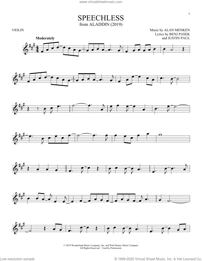 This new feature (still experimental) allows you to ask questions related to this music title to our AI music assistant (powered by OpenAI ChatGPT), trained to answer as an expert on this music title.You may ask questions like "When was this song written?" or "How would you suggest approaching this song?" You can also ask questions about the author or anything else you may think of. Just enter your queries inside the field on the top of the displayed music and click the "Ask" button on the left to start chatting. Remember that the assistant cannot perform catalog searches. It is focused only on this music title. It could also give you wrong or imperfect answers. In that case, click the "regenerate" button on the side of the answer to replace it with a new one. And, of course, you can provide feedback for each answer so we can improve the system. ![]() Naomi Scott: Speechless (from Aladdin) (2019) for violin solo, intermediate violin sheet music. High-Quality and Interactive, transposable in any key, play along. Includes an High-Quality PDF file to download instantly. Licensed to Virtual Sheet Music® by Hal Leonard® publishing company. NOTE: The sample above is just the first page preview of this item. Buy this item to display, print, and play the complete music. Basic Score Info