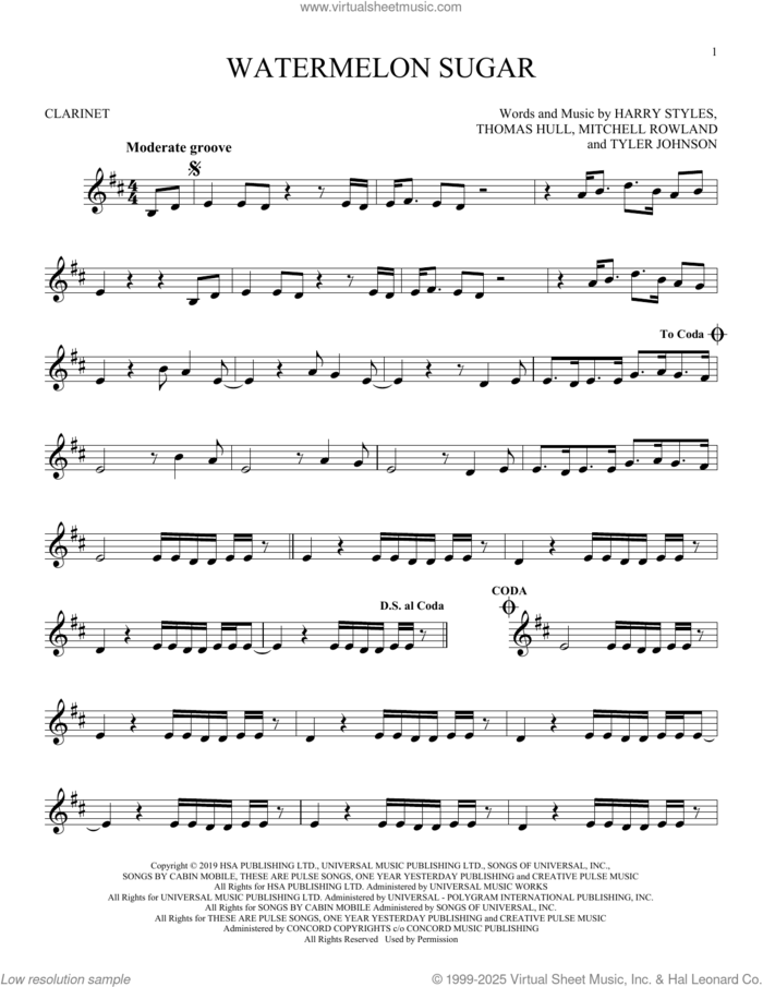 This new feature (still experimental) allows you to ask questions related to this music title to our AI music assistant (powered by OpenAI ChatGPT), trained to answer as an expert on this music title.You may ask questions like "When was this song written?" or "How would you suggest approaching this song?" You can also ask questions about the author or anything else you may think of. Just enter your queries inside the field on the top of the displayed music and click the "Ask" button on the left to start chatting. Remember that the assistant cannot perform catalog searches. It is focused only on this music title. It could also give you wrong or imperfect answers. In that case, click the "regenerate" button on the side of the answer to replace it with a new one. And, of course, you can provide feedback for each answer so we can improve the system. ![]() Harry Styles: Watermelon Sugar for clarinet solo, intermediate clarinet sheet music. High-Quality and Interactive, transposable in any key, play along. Includes an High-Quality PDF file to download instantly. Licensed to Virtual Sheet Music® by Hal Leonard® publishing company. NOTE: The sample above is just the first page preview of this item. Buy this item to display, print, and play the complete music. Basic Score Info