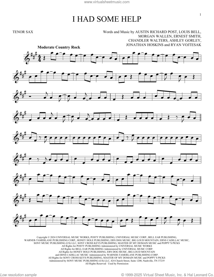 This new feature (still experimental) allows you to ask questions related to this music title to our AI music assistant (powered by OpenAI ChatGPT), trained to answer as an expert on this music title.You may ask questions like "When was this song written?" or "How would you suggest approaching this song?" You can also ask questions about the author or anything else you may think of. Just enter your queries inside the field on the top of the displayed music and click the "Ask" button on the left to start chatting. Remember that the assistant cannot perform catalog searches. It is focused only on this music title. It could also give you wrong or imperfect answers. In that case, click the "regenerate" button on the side of the answer to replace it with a new one. And, of course, you can provide feedback for each answer so we can improve the system. ![]() Post Malone Feat. Morgan Wallen: I Had Some Help for tenor saxophone solo, intermediate tenor sax sheet music. High-Quality and Interactive, transposable in any key, play along. Includes an High-Quality PDF file to download instantly. Licensed to Virtual Sheet Music® by Hal Leonard® publishing company. NOTE: The sample above is just the first page preview of this item. Buy this item to display, print, and play the complete music. Basic Score Info