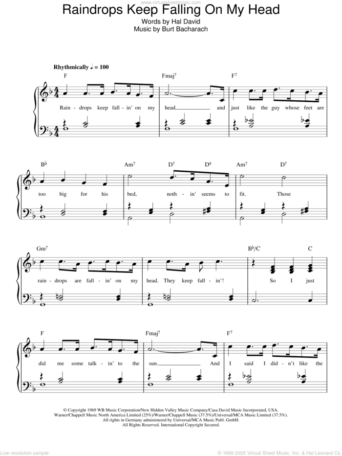 This new feature (still experimental) allows you to ask questions related to this music title to our AI music assistant (powered by OpenAI ChatGPT), trained to answer as an expert on this music title.You may ask questions like "When was this song written?" or "How would you suggest approaching this song?" You can also ask questions about the author or anything else you may think of. Just enter your queries inside the field on the top of the displayed music and click the "Ask" button on the left to start chatting. Remember that the assistant cannot perform catalog searches. It is focused only on this music title. It could also give you wrong or imperfect answers. In that case, click the "regenerate" button on the side of the answer to replace it with a new one. And, of course, you can provide feedback for each answer so we can improve the system. ![]() Bacharach & David: Raindrops Keep Falling On My Head, (easy) for piano solo, easy piano sheet music. Includes an High-Quality PDF file to download instantly. Licensed to Virtual Sheet Music® by Hal Leonard® publishing company. NOTE: The image above is just a preview of the first page of this item. Buy this item to display, print, and enjoy the complete music. Basic Score Info