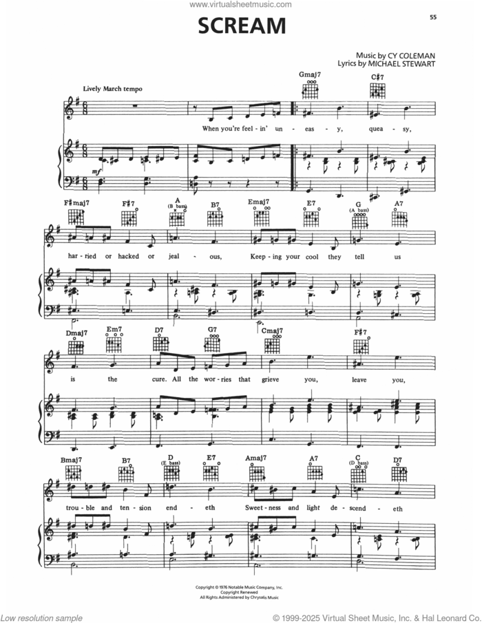 This new feature (still experimental) allows you to ask questions related to this music title to our AI music assistant (powered by OpenAI ChatGPT), trained to answer as an expert on this music title.You may ask questions like "When was this song written?" or "How would you suggest approaching this song?" You can also ask questions about the author or anything else you may think of. Just enter your queries inside the field on the top of the displayed music and click the "Ask" button on the left to start chatting. Remember that the assistant cannot perform catalog searches. It is focused only on this music title. It could also give you wrong or imperfect answers. In that case, click the "regenerate" button on the side of the answer to replace it with a new one. And, of course, you can provide feedback for each answer so we can improve the system. ![]() Cy Coleman: Scream (from I Love My Wife) for voice, piano or guitar, intermediate sheet music. Includes an High-Quality PDF file to download instantly. Licensed to Virtual Sheet Music® by Hal Leonard® publishing company. NOTE: The image above is just a preview of the first page of this item. Buy this item to display, print, and enjoy the complete music. Basic Score Info
