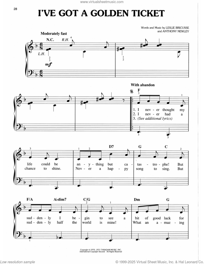 This new feature (still experimental) allows you to ask questions related to this music title to our AI music assistant (powered by OpenAI ChatGPT), trained to answer as an expert on this music title.You may ask questions like "When was this song written?" or "How would you suggest approaching this song?" You can also ask questions about the author or anything else you may think of. Just enter your queries inside the field on the top of the displayed music and click the "Ask" button on the left to start chatting. Remember that the assistant cannot perform catalog searches. It is focused only on this music title. It could also give you wrong or imperfect answers. In that case, click the "regenerate" button on the side of the answer to replace it with a new one. And, of course, you can provide feedback for each answer so we can improve the system. ![]() Leslie Bricusse: I've Got A Golden Ticket (from Willy Wonka and The Chocolate Factory) for piano solo, easy piano sheet music. Includes an High-Quality PDF file to download instantly. Licensed to Virtual Sheet Music® by Hal Leonard® publishing company. NOTE: The image above is just a preview of the first page of this item. Buy this item to display, print, and enjoy the complete music. Basic Score Info