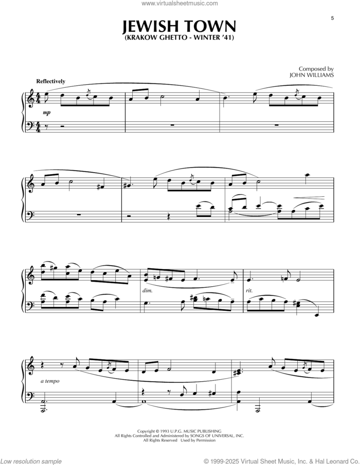 This new feature (still experimental) allows you to ask questions related to this music title to our AI music assistant (powered by OpenAI ChatGPT), trained to answer as an expert on this music title.You may ask questions like "When was this song written?" or "How would you suggest approaching this song?" You can also ask questions about the author or anything else you may think of. Just enter your queries inside the field on the top of the displayed music and click the "Ask" button on the left to start chatting. Remember that the assistant cannot perform catalog searches. It is focused only on this music title. It could also give you wrong or imperfect answers. In that case, click the "regenerate" button on the side of the answer to replace it with a new one. And, of course, you can provide feedback for each answer so we can improve the system. ![]() John Williams: Jewish Town (Krakow Ghetto - Winter '41) (from Schindler's List) for piano solo, intermediate piano sheet music. Includes an High-Quality PDF file to download instantly. Licensed to Virtual Sheet Music® by Hal Leonard® publishing company. NOTE: The image above is just a preview of the first page of this item. Buy this item to display, print, and enjoy the complete music. Basic Score Info