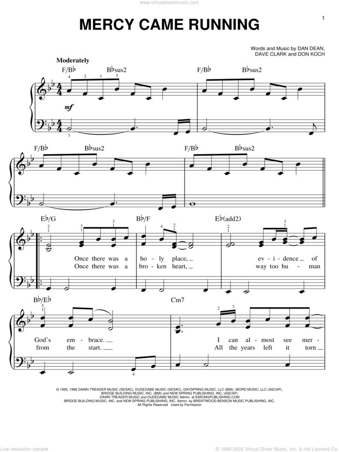 This new feature (still experimental) allows you to ask questions related to this music title to our AI music assistant (powered by OpenAI ChatGPT), trained to answer as an expert on this music title.You may ask questions like "When was this song written?" or "How would you suggest approaching this song?" You can also ask questions about the author or anything else you may think of. Just enter your queries inside the field on the top of the displayed music and click the "Ask" button on the left to start chatting. Remember that the assistant cannot perform catalog searches. It is focused only on this music title. It could also give you wrong or imperfect answers. In that case, click the "regenerate" button on the side of the answer to replace it with a new one. And, of course, you can provide feedback for each answer so we can improve the system. ![]() Phillips, Craig & Dean: Mercy Came Running for piano solo, easy piano sheet music. High-Quality and Interactive, transposable in any key, play along. Includes an High-Quality PDF file to download instantly. Licensed to Virtual Sheet Music® by Hal Leonard® publishing company. NOTE: The sample above is just the first page preview of this item. Buy this item to display, print, and play the complete music. Basic Score Info