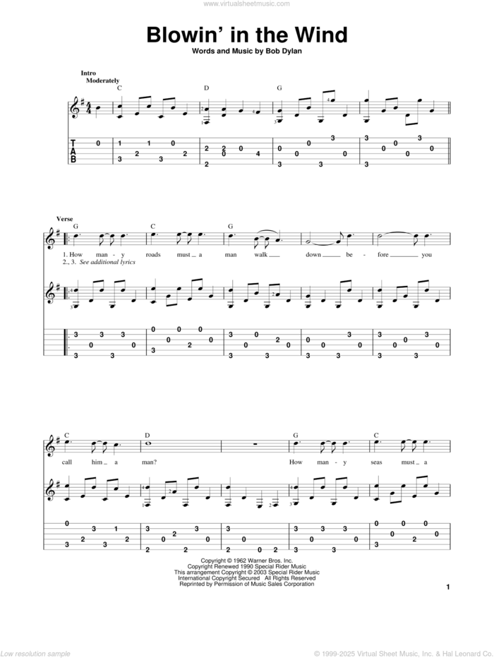 This new feature (still experimental) allows you to ask questions related to this music title to our AI music assistant (powered by OpenAI ChatGPT), trained to answer as an expert on this music title.You may ask questions like "When was this song written?" or "How would you suggest approaching this song?" You can also ask questions about the author or anything else you may think of. Just enter your queries inside the field on the top of the displayed music and click the "Ask" button on the left to start chatting. Remember that the assistant cannot perform catalog searches. It is focused only on this music title. It could also give you wrong or imperfect answers. In that case, click the "regenerate" button on the side of the answer to replace it with a new one. And, of course, you can provide feedback for each answer so we can improve the system. ![]() Bob Dylan: Blowin' In The Wind for guitar solo, intermediate guitar sheet music. Includes an High-Quality PDF file to download instantly. Licensed to Virtual Sheet Music® by Hal Leonard® publishing company. NOTE: The image above is just a preview of the first page of this item. Buy this item to display, print, and enjoy the complete music. Basic Score Info