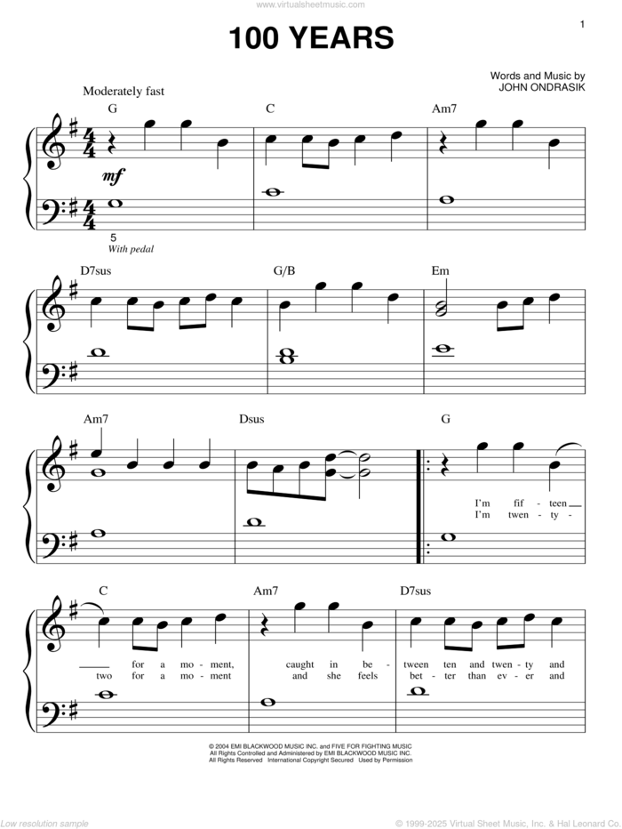 This new feature (still experimental) allows you to ask questions related to this music title to our AI music assistant (powered by OpenAI ChatGPT), trained to answer as an expert on this music title.You may ask questions like "When was this song written?" or "How would you suggest approaching this song?" You can also ask questions about the author or anything else you may think of. Just enter your queries inside the field on the top of the displayed music and click the "Ask" button on the left to start chatting. Remember that the assistant cannot perform catalog searches. It is focused only on this music title. It could also give you wrong or imperfect answers. In that case, click the "regenerate" button on the side of the answer to replace it with a new one. And, of course, you can provide feedback for each answer so we can improve the system. ![]() Five For Fighting: 100 Years for piano solo (big note book), easy piano (big note book) sheet music. High-Quality and Interactive, transposable in any key, play along. Includes an High-Quality PDF file to download instantly. Licensed to Virtual Sheet Music® by Hal Leonard® publishing company. NOTE: The sample above is just the first page preview of this item. Buy this item to display, print, and play the complete music. Basic Score Info