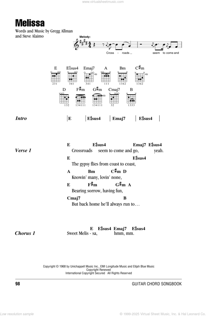 This new feature (still experimental) allows you to ask questions related to this music title to our AI music assistant (powered by OpenAI ChatGPT), trained to answer as an expert on this music title.You may ask questions like "When was this song written?" or "How would you suggest approaching this song?" You can also ask questions about the author or anything else you may think of. Just enter your queries inside the field on the top of the displayed music and click the "Ask" button on the left to start chatting. Remember that the assistant cannot perform catalog searches. It is focused only on this music title. It could also give you wrong or imperfect answers. In that case, click the "regenerate" button on the side of the answer to replace it with a new one. And, of course, you can provide feedback for each answer so we can improve the system. ![]() Allman Brothers Band: Melissa for guitar (chords), intermediate sheet music. Includes an High-Quality PDF file to download instantly. Licensed to Virtual Sheet Music® by Hal Leonard® publishing company. NOTE: The image above is just a preview of the first page of this item. Buy this item to display, print, and enjoy the complete music. Basic Score Info