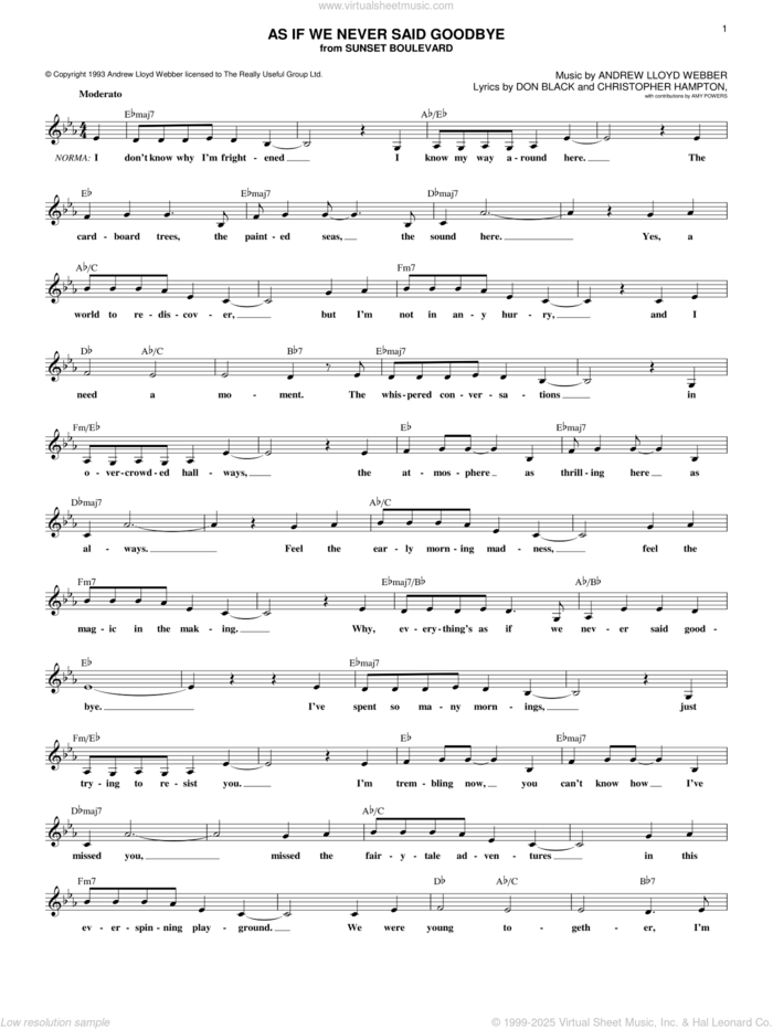 This new feature (still experimental) allows you to ask questions related to this music title to our AI music assistant (powered by OpenAI ChatGPT), trained to answer as an expert on this music title.You may ask questions like "When was this song written?" or "How would you suggest approaching this song?" You can also ask questions about the author or anything else you may think of. Just enter your queries inside the field on the top of the displayed music and click the "Ask" button on the left to start chatting. Remember that the assistant cannot perform catalog searches. It is focused only on this music title. It could also give you wrong or imperfect answers. In that case, click the "regenerate" button on the side of the answer to replace it with a new one. And, of course, you can provide feedback for each answer so we can improve the system. ![]() Andrew Lloyd Webber: As If We Never Said Goodbye (from Sunset Boulevard) for voice and other instruments (fake book), intermediate voice sheet music. High-Quality and Interactive, transposable in any key, play along. Includes an High-Quality PDF file to download instantly. Licensed to Virtual Sheet Music® by Hal Leonard® publishing company. NOTE: The sample above is just the first page preview of this item. Buy this item to display, print, and play the complete music. Basic Score Info