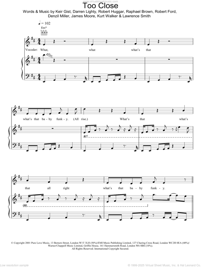This new feature (still experimental) allows you to ask questions related to this music title to our AI music assistant (powered by OpenAI ChatGPT), trained to answer as an expert on this music title.You may ask questions like "When was this song written?" or "How would you suggest approaching this song?" You can also ask questions about the author or anything else you may think of. Just enter your queries inside the field on the top of the displayed music and click the "Ask" button on the left to start chatting. Remember that the assistant cannot perform catalog searches. It is focused only on this music title. It could also give you wrong or imperfect answers. In that case, click the "regenerate" button on the side of the answer to replace it with a new one. And, of course, you can provide feedback for each answer so we can improve the system. ![]() Too Close for voice, piano or guitar, intermediate sheet music. Includes an High-Quality PDF file to download instantly. Licensed to Virtual Sheet Music® by Hal Leonard® publishing company. NOTE: The image above is just a preview of the first page of this item. Buy this item to display, print, and enjoy the complete music. Basic Score Info