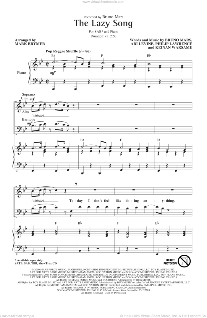 This new feature (still experimental) allows you to ask questions related to this music title to our AI music assistant (powered by OpenAI ChatGPT), trained to answer as an expert on this music title.You may ask questions like "When was this song written?" or "How would you suggest approaching this song?" You can also ask questions about the author or anything else you may think of. Just enter your queries inside the field on the top of the displayed music and click the "Ask" button on the left to start chatting. Remember that the assistant cannot perform catalog searches. It is focused only on this music title. It could also give you wrong or imperfect answers. In that case, click the "regenerate" button on the side of the answer to replace it with a new one. And, of course, you can provide feedback for each answer so we can improve the system. ![]() Bruno Mars: The Lazy Song (arr. Mark Brymer) for choir (SAB: soprano, alto, bass), intermediate sheet music. Includes an High-Quality PDF file to download instantly. Licensed to Virtual Sheet Music® by Hal Leonard® publishing company. NOTE: The image above is just a preview of the first page of this item. Buy this item to display, print, and enjoy the complete music. Basic Score Info