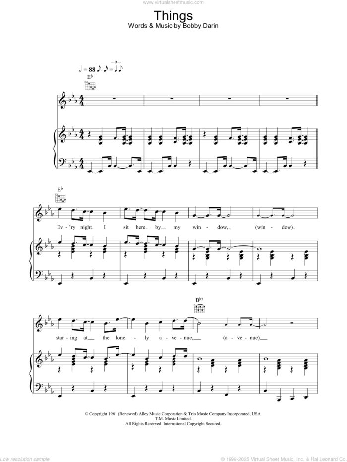 This new feature (still experimental) allows you to ask questions related to this music title to our AI music assistant (powered by OpenAI ChatGPT), trained to answer as an expert on this music title.You may ask questions like "When was this song written?" or "How would you suggest approaching this song?" You can also ask questions about the author or anything else you may think of. Just enter your queries inside the field on the top of the displayed music and click the "Ask" button on the left to start chatting. Remember that the assistant cannot perform catalog searches. It is focused only on this music title. It could also give you wrong or imperfect answers. In that case, click the "regenerate" button on the side of the answer to replace it with a new one. And, of course, you can provide feedback for each answer so we can improve the system. ![]() Bobby Darin: Things for voice, piano or guitar, intermediate sheet music. High-Quality and Interactive, transposable in any key, play along. Includes an High-Quality PDF file to download instantly. Licensed to Virtual Sheet Music® by Hal Leonard® publishing company. NOTE: The sample above is just the first page preview of this item. Buy this item to display, print, and play the complete music. Basic Score Info