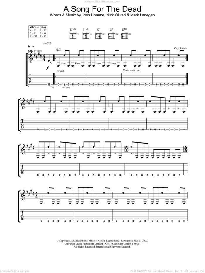 This new feature (still experimental) allows you to ask questions related to this music title to our AI music assistant (powered by OpenAI ChatGPT), trained to answer as an expert on this music title.You may ask questions like "When was this song written?" or "How would you suggest approaching this song?" You can also ask questions about the author or anything else you may think of. Just enter your queries inside the field on the top of the displayed music and click the "Ask" button on the left to start chatting. Remember that the assistant cannot perform catalog searches. It is focused only on this music title. It could also give you wrong or imperfect answers. In that case, click the "regenerate" button on the side of the answer to replace it with a new one. And, of course, you can provide feedback for each answer so we can improve the system. ![]() Queens Of The Stone Age: A Song For The Dead for guitar (tablature), intermediate sheet music. Includes an High-Quality PDF file to download instantly. Licensed to Virtual Sheet Music® by Hal Leonard® publishing company. NOTE: The image above is just a preview of the first page of this item. Buy this item to display, print, and enjoy the complete music. Basic Score Info