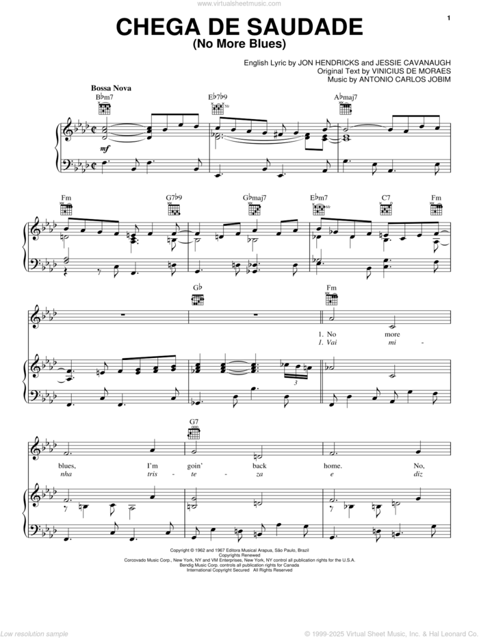 This new feature (still experimental) allows you to ask questions related to this music title to our AI music assistant (powered by OpenAI ChatGPT), trained to answer as an expert on this music title.You may ask questions like "When was this song written?" or "How would you suggest approaching this song?" You can also ask questions about the author or anything else you may think of. Just enter your queries inside the field on the top of the displayed music and click the "Ask" button on the left to start chatting. Remember that the assistant cannot perform catalog searches. It is focused only on this music title. It could also give you wrong or imperfect answers. In that case, click the "regenerate" button on the side of the answer to replace it with a new one. And, of course, you can provide feedback for each answer so we can improve the system. ![]() Vinicius de Moraes: Chega De Saudade (No More Blues) for voice, piano or guitar, intermediate sheet music. High-Quality and Interactive, transposable in any key, play along. Includes an High-Quality PDF file to download instantly. Licensed to Virtual Sheet Music® by Hal Leonard® publishing company. NOTE: The sample above is just the first page preview of this item. Buy this item to display, print, and play the complete music. Basic Score Info