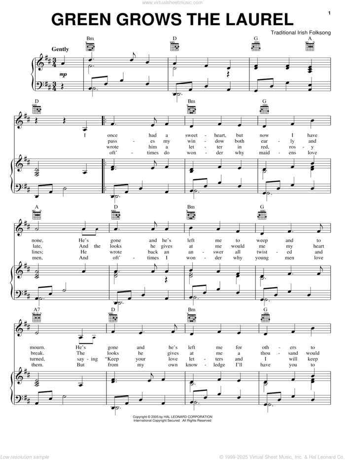 This new feature (still experimental) allows you to ask questions related to this music title to our AI music assistant (powered by OpenAI ChatGPT), trained to answer as an expert on this music title.You may ask questions like "When was this song written?" or "How would you suggest approaching this song?" You can also ask questions about the author or anything else you may think of. Just enter your queries inside the field on the top of the displayed music and click the "Ask" button on the left to start chatting. Remember that the assistant cannot perform catalog searches. It is focused only on this music title. It could also give you wrong or imperfect answers. In that case, click the "regenerate" button on the side of the answer to replace it with a new one. And, of course, you can provide feedback for each answer so we can improve the system. ![]() Green Grows The Laurel for voice, piano or guitar, intermediate sheet music. High-Quality and Interactive, transposable in any key, play along. Includes an High-Quality PDF file to download instantly. Licensed to Virtual Sheet Music® by Hal Leonard® publishing company. NOTE: The sample above is just the first page preview of this item. Buy this item to display, print, and play the complete music. Basic Score Info
