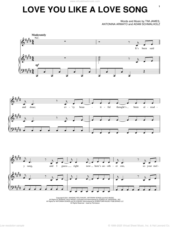 This new feature (still experimental) allows you to ask questions related to this music title to our AI music assistant (powered by OpenAI ChatGPT), trained to answer as an expert on this music title.You may ask questions like "When was this song written?" or "How would you suggest approaching this song?" You can also ask questions about the author or anything else you may think of. Just enter your queries inside the field on the top of the displayed music and click the "Ask" button on the left to start chatting. Remember that the assistant cannot perform catalog searches. It is focused only on this music title. It could also give you wrong or imperfect answers. In that case, click the "regenerate" button on the side of the answer to replace it with a new one. And, of course, you can provide feedback for each answer so we can improve the system. ![]() Selena Gomez: Love You Like A Love Song for voice, piano or guitar, intermediate sheet music. High-Quality and Interactive, transposable in any key, play along. Includes an High-Quality PDF file to download instantly. Licensed to Virtual Sheet Music® by Hal Leonard® publishing company. NOTE: The sample above is just the first page preview of this item. Buy this item to display, print, and play the complete music. Basic Score Info