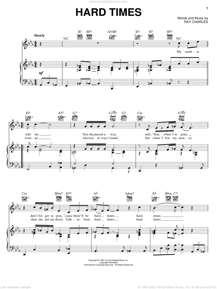 This new feature (still experimental) allows you to ask questions related to this music title to our AI music assistant (powered by OpenAI ChatGPT), trained to answer as an expert on this music title.You may ask questions like "When was this song written?" or "How would you suggest approaching this song?" You can also ask questions about the author or anything else you may think of. Just enter your queries inside the field on the top of the displayed music and click the "Ask" button on the left to start chatting. Remember that the assistant cannot perform catalog searches. It is focused only on this music title. It could also give you wrong or imperfect answers. In that case, click the "regenerate" button on the side of the answer to replace it with a new one. And, of course, you can provide feedback for each answer so we can improve the system. ![]() Ray Charles: Hard Times for voice, piano or guitar, intermediate sheet music. High-Quality and Interactive, transposable in any key, play along. Includes an High-Quality PDF file to download instantly. Licensed to Virtual Sheet Music® by Hal Leonard® publishing company. NOTE: The sample above is just the first page preview of this item. Buy this item to display, print, and play the complete music. Basic Score Info
