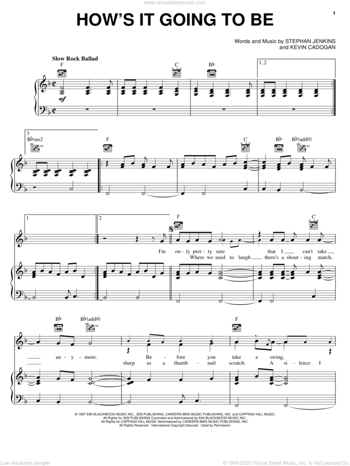 This new feature (still experimental) allows you to ask questions related to this music title to our AI music assistant (powered by OpenAI ChatGPT), trained to answer as an expert on this music title.You may ask questions like "When was this song written?" or "How would you suggest approaching this song?" You can also ask questions about the author or anything else you may think of. Just enter your queries inside the field on the top of the displayed music and click the "Ask" button on the left to start chatting. Remember that the assistant cannot perform catalog searches. It is focused only on this music title. It could also give you wrong or imperfect answers. In that case, click the "regenerate" button on the side of the answer to replace it with a new one. And, of course, you can provide feedback for each answer so we can improve the system. ![]() Third Eye Blind: How's It Going To Be for voice, piano or guitar, intermediate sheet music. High-Quality and Interactive, transposable in any key, play along. Includes an High-Quality PDF file to download instantly. Licensed to Virtual Sheet Music® by Hal Leonard® publishing company. NOTE: The sample above is just the first page preview of this item. Buy this item to display, print, and play the complete music. Basic Score Info