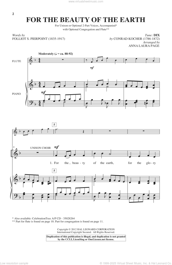This new feature (still experimental) allows you to ask questions related to this music title to our AI music assistant (powered by OpenAI ChatGPT), trained to answer as an expert on this music title.You may ask questions like "When was this song written?" or "How would you suggest approaching this song?" You can also ask questions about the author or anything else you may think of. Just enter your queries inside the field on the top of the displayed music and click the "Ask" button on the left to start chatting. Remember that the assistant cannot perform catalog searches. It is focused only on this music title. It could also give you wrong or imperfect answers. In that case, click the "regenerate" button on the side of the answer to replace it with a new one. And, of course, you can provide feedback for each answer so we can improve the system. ![]() Conrad Kocher: For The Beauty Of The Earth (arr. Anna Laura Page) for choir (2-Part), intermediate sheet music. Includes an High-Quality PDF file to download instantly. Licensed to Virtual Sheet Music® by Hal Leonard® publishing company. NOTE: The image above is just a preview of the first page of this item. Buy this item to display, print, and enjoy the complete music. Basic Score Info