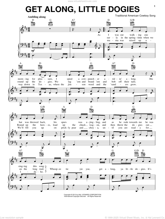 This new feature (still experimental) allows you to ask questions related to this music title to our AI music assistant (powered by OpenAI ChatGPT), trained to answer as an expert on this music title.You may ask questions like "When was this song written?" or "How would you suggest approaching this song?" You can also ask questions about the author or anything else you may think of. Just enter your queries inside the field on the top of the displayed music and click the "Ask" button on the left to start chatting. Remember that the assistant cannot perform catalog searches. It is focused only on this music title. It could also give you wrong or imperfect answers. In that case, click the "regenerate" button on the side of the answer to replace it with a new one. And, of course, you can provide feedback for each answer so we can improve the system. ![]() Get Along, Little Dogies for voice, piano or guitar, intermediate sheet music. High-Quality and Interactive, transposable in any key, play along. Includes an High-Quality PDF file to download instantly. Licensed to Virtual Sheet Music® by Hal Leonard® publishing company. NOTE: The sample above is just the first page preview of this item. Buy this item to display, print, and play the complete music. Basic Score Info
