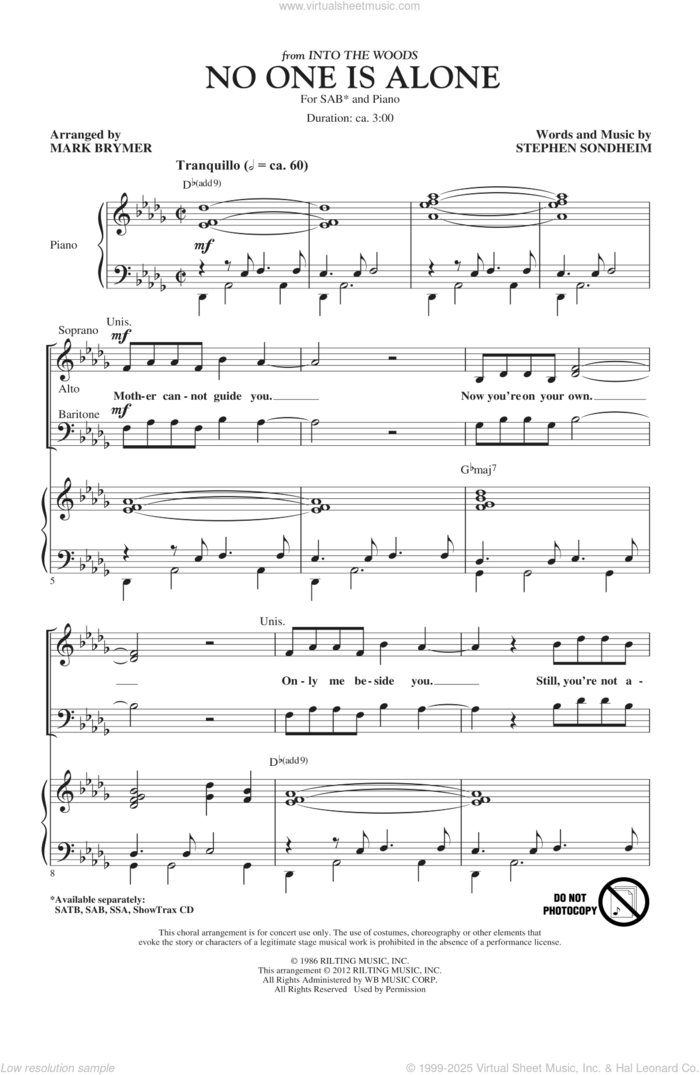 This new feature (still experimental) allows you to ask questions related to this music title to our AI music assistant (powered by OpenAI ChatGPT), trained to answer as an expert on this music title.You may ask questions like "When was this song written?" or "How would you suggest approaching this song?" You can also ask questions about the author or anything else you may think of. Just enter your queries inside the field on the top of the displayed music and click the "Ask" button on the left to start chatting. Remember that the assistant cannot perform catalog searches. It is focused only on this music title. It could also give you wrong or imperfect answers. In that case, click the "regenerate" button on the side of the answer to replace it with a new one. And, of course, you can provide feedback for each answer so we can improve the system. ![]() Stephen Sondheim: No One Is Alone - Part I for choir (SAB: soprano, alto, bass), intermediate sheet music. Includes an High-Quality PDF file to download instantly. Licensed to Virtual Sheet Music® by Hal Leonard® publishing company. NOTE: The image above is just a preview of the first page of this item. Buy this item to display, print, and enjoy the complete music. Basic Score Info
