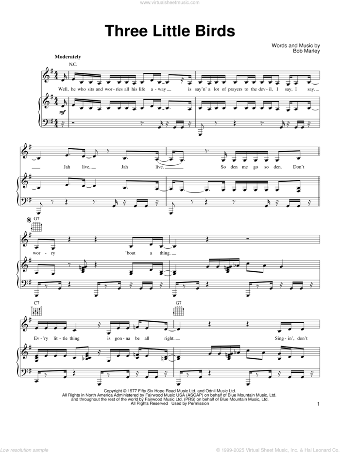 This new feature (still experimental) allows you to ask questions related to this music title to our AI music assistant (powered by OpenAI ChatGPT), trained to answer as an expert on this music title.You may ask questions like "When was this song written?" or "How would you suggest approaching this song?" You can also ask questions about the author or anything else you may think of. Just enter your queries inside the field on the top of the displayed music and click the "Ask" button on the left to start chatting. Remember that the assistant cannot perform catalog searches. It is focused only on this music title. It could also give you wrong or imperfect answers. In that case, click the "regenerate" button on the side of the answer to replace it with a new one. And, of course, you can provide feedback for each answer so we can improve the system. ![]() Ziggy Marley & Sean Paul: Three Little Birds for voice, piano or guitar, intermediate sheet music. High-Quality and Interactive, transposable in any key, play along. Includes an High-Quality PDF file to download instantly. Licensed to Virtual Sheet Music® by Hal Leonard® publishing company. NOTE: The sample above is just the first page preview of this item. Buy this item to display, print, and play the complete music. Basic Score Info