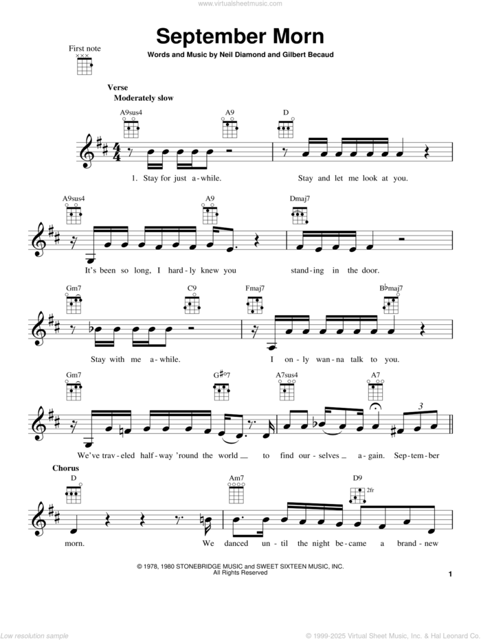 This new feature (still experimental) allows you to ask questions related to this music title to our AI music assistant (powered by OpenAI ChatGPT), trained to answer as an expert on this music title.You may ask questions like "When was this song written?" or "How would you suggest approaching this song?" You can also ask questions about the author or anything else you may think of. Just enter your queries inside the field on the top of the displayed music and click the "Ask" button on the left to start chatting. Remember that the assistant cannot perform catalog searches. It is focused only on this music title. It could also give you wrong or imperfect answers. In that case, click the "regenerate" button on the side of the answer to replace it with a new one. And, of course, you can provide feedback for each answer so we can improve the system. ![]() Neil Diamond: September Morn for ukulele, intermediate sheet music. High-Quality and Interactive, transposable in any key, play along. Includes an High-Quality PDF file to download instantly. Licensed to Virtual Sheet Music® by Hal Leonard® publishing company. NOTE: The sample above is just the first page preview of this item. Buy this item to display, print, and play the complete music. Basic Score Info