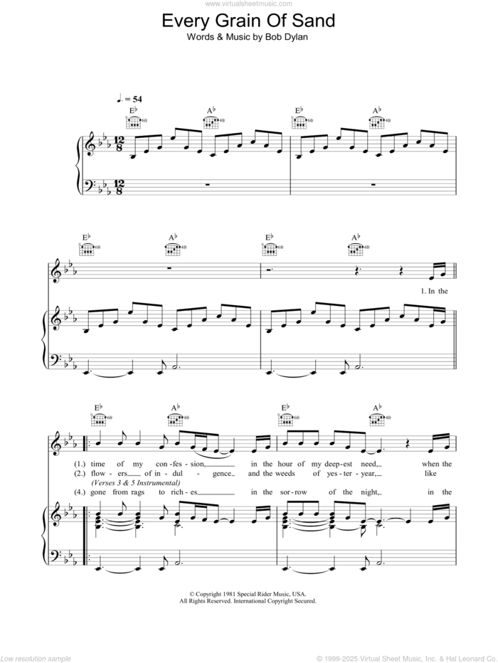 This new feature (still experimental) allows you to ask questions related to this music title to our AI music assistant (powered by OpenAI ChatGPT), trained to answer as an expert on this music title.You may ask questions like "When was this song written?" or "How would you suggest approaching this song?" You can also ask questions about the author or anything else you may think of. Just enter your queries inside the field on the top of the displayed music and click the "Ask" button on the left to start chatting. Remember that the assistant cannot perform catalog searches. It is focused only on this music title. It could also give you wrong or imperfect answers. In that case, click the "regenerate" button on the side of the answer to replace it with a new one. And, of course, you can provide feedback for each answer so we can improve the system. ![]() Bob Dylan: Every Grain Of Sand for voice, piano or guitar, intermediate sheet music. Includes an High-Quality PDF file to download instantly. Licensed to Virtual Sheet Music® by Hal Leonard® publishing company. NOTE: The image above is just a preview of the first page of this item. Buy this item to display, print, and enjoy the complete music. Basic Score Info