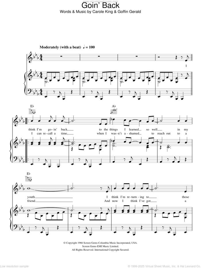 This new feature (still experimental) allows you to ask questions related to this music title to our AI music assistant (powered by OpenAI ChatGPT), trained to answer as an expert on this music title.You may ask questions like "When was this song written?" or "How would you suggest approaching this song?" You can also ask questions about the author or anything else you may think of. Just enter your queries inside the field on the top of the displayed music and click the "Ask" button on the left to start chatting. Remember that the assistant cannot perform catalog searches. It is focused only on this music title. It could also give you wrong or imperfect answers. In that case, click the "regenerate" button on the side of the answer to replace it with a new one. And, of course, you can provide feedback for each answer so we can improve the system. ![]() Dusty Springfield: Goin' Back for voice, piano or guitar, intermediate sheet music. Includes an High-Quality PDF file to download instantly. Licensed to Virtual Sheet Music® by Hal Leonard® publishing company. NOTE: The image above is just a preview of the first page of this item. Buy this item to display, print, and enjoy the complete music. Basic Score Info