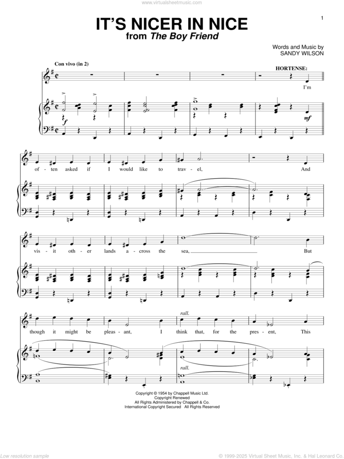 This new feature (still experimental) allows you to ask questions related to this music title to our AI music assistant (powered by OpenAI ChatGPT), trained to answer as an expert on this music title.You may ask questions like "When was this song written?" or "How would you suggest approaching this song?" You can also ask questions about the author or anything else you may think of. Just enter your queries inside the field on the top of the displayed music and click the "Ask" button on the left to start chatting. Remember that the assistant cannot perform catalog searches. It is focused only on this music title. It could also give you wrong or imperfect answers. In that case, click the "regenerate" button on the side of the answer to replace it with a new one. And, of course, you can provide feedback for each answer so we can improve the system. ![]() Sandy Wilson: It's Nicer In Nice for voice and piano, intermediate voice sheet music. High-Quality and Interactive, transposable in any key, play along. Includes an High-Quality PDF file to download instantly. Licensed to Virtual Sheet Music® by Hal Leonard® publishing company. NOTE: The sample above is just the first page preview of this item. Buy this item to display, print, and play the complete music. Basic Score Info
