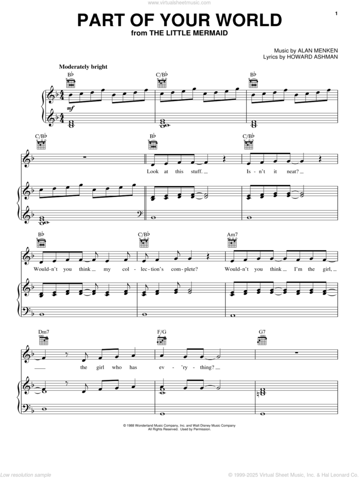 This new feature (still experimental) allows you to ask questions related to this music title to our AI music assistant (powered by OpenAI ChatGPT), trained to answer as an expert on this music title.You may ask questions like "When was this song written?" or "How would you suggest approaching this song?" You can also ask questions about the author or anything else you may think of. Just enter your queries inside the field on the top of the displayed music and click the "Ask" button on the left to start chatting. Remember that the assistant cannot perform catalog searches. It is focused only on this music title. It could also give you wrong or imperfect answers. In that case, click the "regenerate" button on the side of the answer to replace it with a new one. And, of course, you can provide feedback for each answer so we can improve the system. ![]() Alan Menken: Part Of Your World (from The Little Mermaid) for voice, piano or guitar, intermediate sheet music. High-Quality and Interactive, transposable in any key, play along. Includes an High-Quality PDF file to download instantly. Licensed to Virtual Sheet Music® by Hal Leonard® publishing company. NOTE: The sample above is just the first page preview of this item. Buy this item to display, print, and play the complete music. Basic Score Info