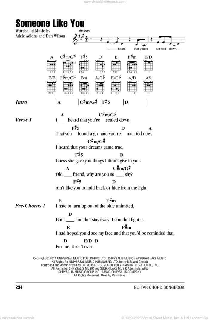 This new feature (still experimental) allows you to ask questions related to this music title to our AI music assistant (powered by OpenAI ChatGPT), trained to answer as an expert on this music title.You may ask questions like "When was this song written?" or "How would you suggest approaching this song?" You can also ask questions about the author or anything else you may think of. Just enter your queries inside the field on the top of the displayed music and click the "Ask" button on the left to start chatting. Remember that the assistant cannot perform catalog searches. It is focused only on this music title. It could also give you wrong or imperfect answers. In that case, click the "regenerate" button on the side of the answer to replace it with a new one. And, of course, you can provide feedback for each answer so we can improve the system. ![]() Adele: Someone Like You for guitar (chords), intermediate sheet music. Includes an High-Quality PDF file to download instantly. Licensed to Virtual Sheet Music® by Hal Leonard® publishing company. NOTE: The image above is just a preview of the first page of this item. Buy this item to display, print, and enjoy the complete music. Basic Score Info