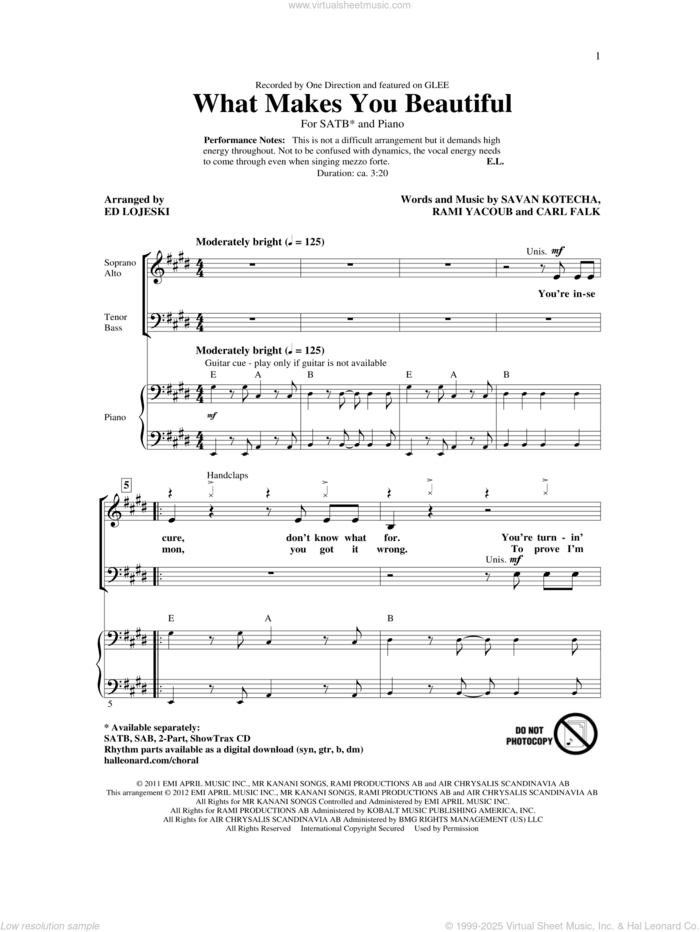 This new feature (still experimental) allows you to ask questions related to this music title to our AI music assistant (powered by OpenAI ChatGPT), trained to answer as an expert on this music title.You may ask questions like "When was this song written?" or "How would you suggest approaching this song?" You can also ask questions about the author or anything else you may think of. Just enter your queries inside the field on the top of the displayed music and click the "Ask" button on the left to start chatting. Remember that the assistant cannot perform catalog searches. It is focused only on this music title. It could also give you wrong or imperfect answers. In that case, click the "regenerate" button on the side of the answer to replace it with a new one. And, of course, you can provide feedback for each answer so we can improve the system. ![]() Ed Lojeski: What Makes You Beautiful for choir (SATB: soprano, alto, tenor, bass), intermediate sheet music. High-Quality and Interactive, transposable in any key, play along. Includes an High-Quality PDF file to download instantly. Licensed to Virtual Sheet Music® by Hal Leonard® publishing company. NOTE: The sample above is just the first page preview of this item. Buy this item to display, print, and play the complete music. Basic Score Info