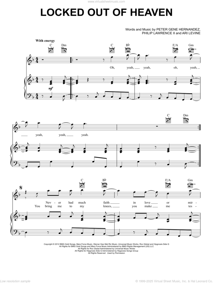 This new feature (still experimental) allows you to ask questions related to this music title to our AI music assistant (powered by OpenAI ChatGPT), trained to answer as an expert on this music title.You may ask questions like "When was this song written?" or "How would you suggest approaching this song?" You can also ask questions about the author or anything else you may think of. Just enter your queries inside the field on the top of the displayed music and click the "Ask" button on the left to start chatting. Remember that the assistant cannot perform catalog searches. It is focused only on this music title. It could also give you wrong or imperfect answers. In that case, click the "regenerate" button on the side of the answer to replace it with a new one. And, of course, you can provide feedback for each answer so we can improve the system. ![]() Bruno Mars: Locked Out Of Heaven for voice, piano or guitar, intermediate sheet music. High-Quality and Interactive, transposable in any key, play along. Includes an High-Quality PDF file to download instantly. Licensed to Virtual Sheet Music® by Hal Leonard® publishing company. NOTE: The sample above is just the first page preview of this item. Buy this item to display, print, and play the complete music. Basic Score Info